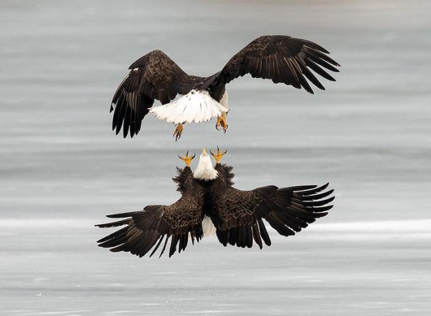 Two eagles locking talons high above the ground might look like they’re risking injury, but it’s a normal courtship behavior called the “cartwheel display.” Fully entangled, the two birds begin spinning to the earth, disengaging just before they smack the ground. Their clasp could last for hours. At last, the eagles unlock talons and fly off. Rival adults sometimes perform the same flight.