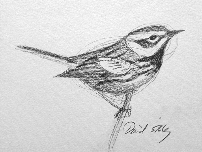 David Sibley’s paintings connect millions of people with the lives of birds. His talent in observing and portraying birds culminated in The Sibley Guide to Birds. Sibley describes how he learned to sketch and illustrate birds such as this Townsend’s Warbler: “I spent years in the field, just traveling and birding and sketching,” he says. “ The drawing was so important to me, that there was never any question in my mind of continuing to paint the birds. It’s how I study the birds.”