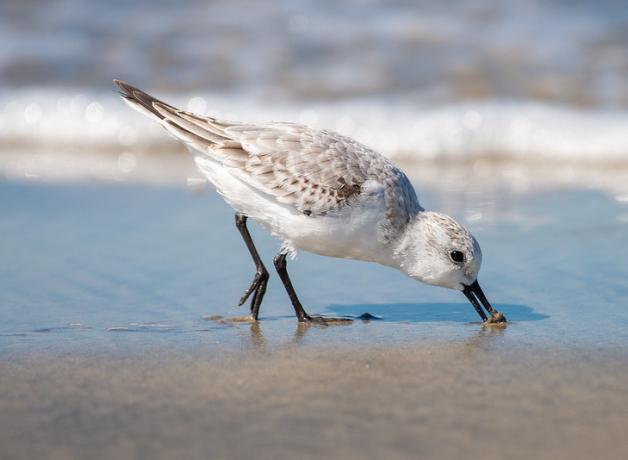 While many shorebirds have gone south, tiny sandpipers called Sanderlings are easy to find on winter shores. They follow the waves as they lap in and out, probing the swirling sand for prey. They often eat various small crustaceans such as mole crabs, isopods, and amphipods. But they also enjoy miniature clams, polychaete worms, and horseshoe crab eggs. They’ll even catch flying insects or eat plant matter.