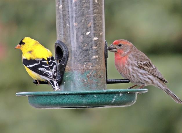 The songs of two common finches provide a steady soundtrack in cities across North America: the House Finch and the American Goldfinch. While they can sound similar, a couple of key features help set them apart. House Finches sing sweetly but often have a sharp, buzzy note near the end. Goldfinches sing rapidly, often repeating a note several times. They also often make their distinctive call, which sounds like someone quickly saying “potato chip!”