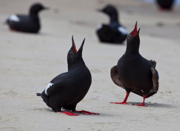 Although many seabirds utter groans and croaks, the Pigeon Guillemot produces a lovely series of trills and whistles. As part of their courtship, they fly side by side in large circles and loops, a perfectly synchronized flying act. These guillemots do not breed until they are between three and five years old. The male chooses a site in a crevice or cave, among boulders, under driftwood, on a wharf, or even in a pipe.