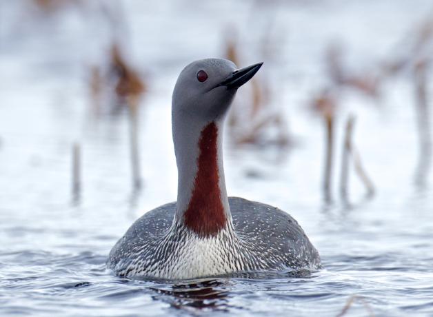 The word “loon” comes from the Old Norse word for “lame.” Because their feet are so far back on their bodies, loons cannot walk on land. But in flight, they’re graceful, and underwater, they’re swift in pursuit of fish. Red-throated Loons – like this one – breed in the far north and winter along both coasts of the United States.