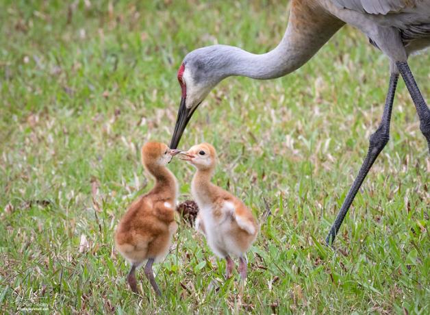 Sandhill Crane families form a close bond. A pair of adults might travel north with their young from the previous summer, along with grown-up offspring from several years ago. After the breeding season, families will stick together for the journey south and the winter, even in large flocks. The parents often remain together for the rest of their lives.