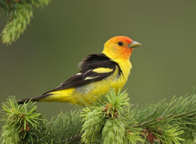 Western Tanagers dart from tree to tree, on the lookout for delicious bugs. They’ll find them by scanning the tree bark — or maybe snatching them from mid-air during flight — a tactic called hawking. Come winter, these lovely songbirds head south, where they fit right in with the other brightly colored tropical birds they’ll spend the winter with in Mexico and Central America.