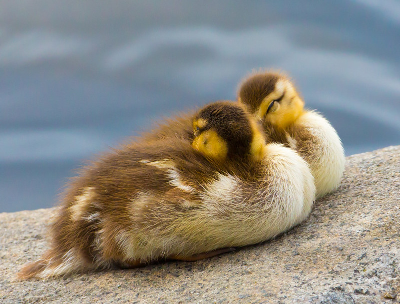 All birds need to sleep — or at least snooze — sometime during each 24-hour period. And most sleep at night. A bird (such as these Mallard Ducklings) may turn its head around and warm its beak under its shoulder-feathers. Songbirds find a protected perch, sheltered from rain and nighttime predators. Small forest birds often spend the night in tree cavities. Ducks sleep while floating in protected bays.